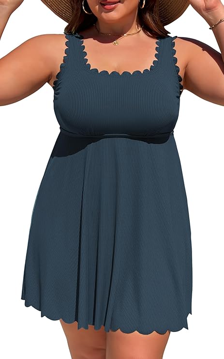 This exquisite swim dress features a unique ruffle design and ribbed fabric that enhances its aesthetic appeal. With its built-in tummy control, it provides a smooth silhouette, making it an excellent choice as the best plus size swim dress for women who want both functionality and fashion.