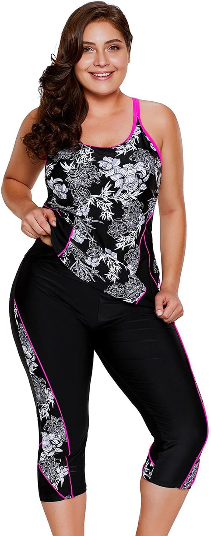 Tailored with a fashionable pink and black floral design, this swimsuit features a long tankini top with an elastic-banded bralette, enhancing both support and style. The high-waisted capris offer full coverage, ensuring you feel confident and secure. With a price point of just $38, it combines affordability with exemplary quality.