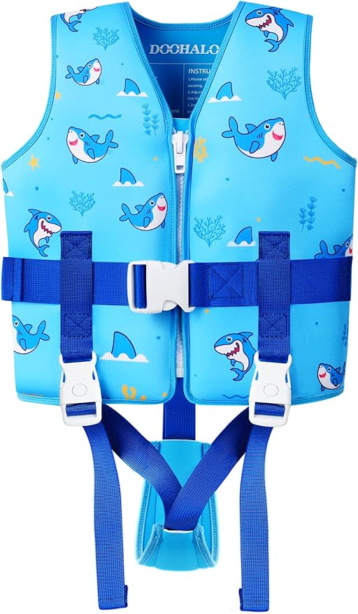 The DOOHALO vest, tailored for toddlers weighing between 22-33 lbs, offers a snug fit with adjustable safety features. Its vibrant blue shark design is not just eye-catching, but functional, with detachable foam blocks to adjust buoyancy, ensuring your child’s swimming experience is enjoyable and secure.
